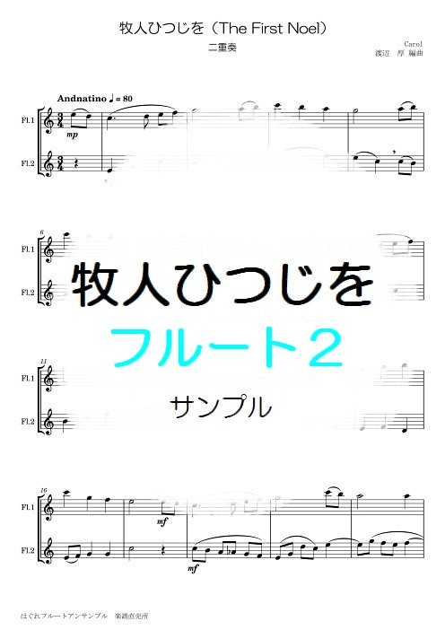 | 一緒に歌って頂くためのアレンジになっています。 前奏があって、2番の最後にそのまま終わります。 「はい!終わり!」って感じで。 演奏者が4人いる時は、余った人は歌いましょう。 クリスマス演奏の後のアンコールなどにどうぞ。 ※こちらの楽譜は、以下の詰合せセットにも収録されています。 ■詰合せ 童謡唱歌 フルート2重奏・3重奏 ■詰合せ 童謡唱歌 フルート3重奏・4重奏 →楽譜はこんな感じ(1ページ目の画像) ♪試聴 →ご購入はこちらから |